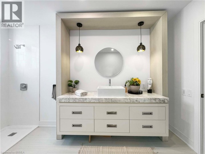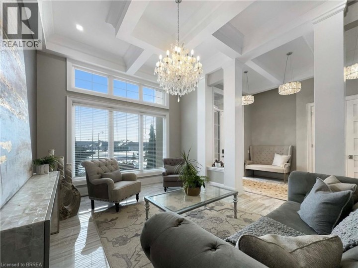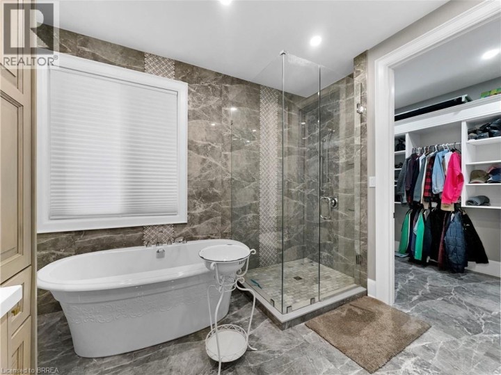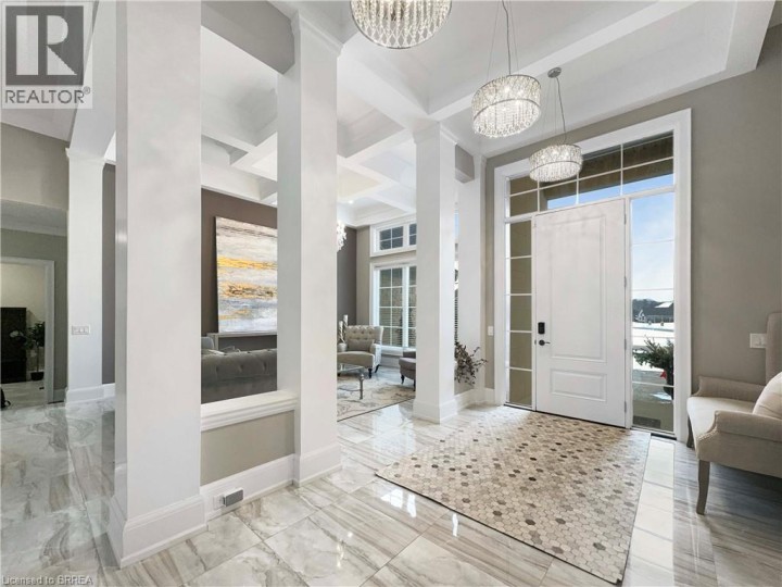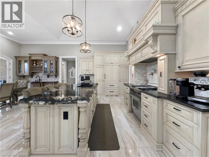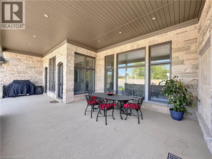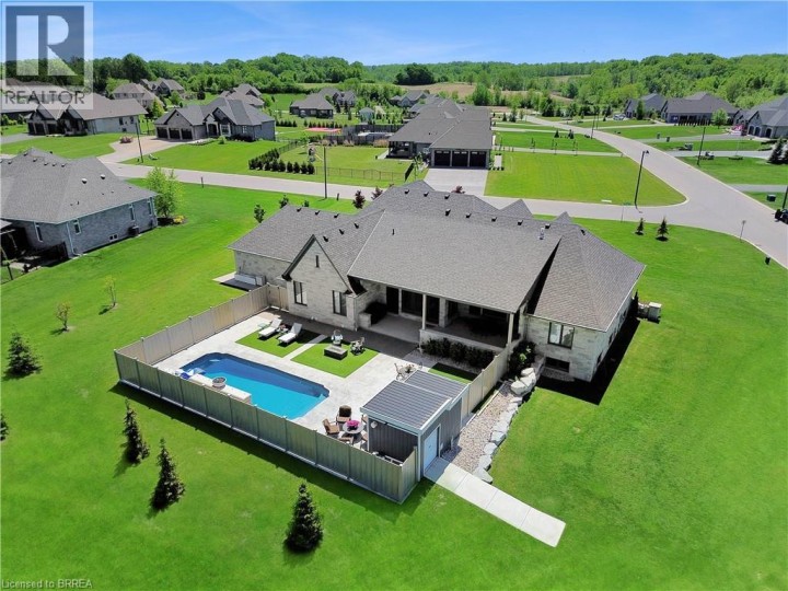 Welcome to 18 Harper Blvd, a luxurious 5-bed, 4-bath stone bungalow nestled on an expansive three-quarter-acre estate in Brantford, Ontario. Step inside to discover a grand entry leading to a bright living area adorned with coffered ceilings and elegant marble tile. The open kitchen, with soaring 15-ft ceilings, is equipped with state-of-the-art appliances, including a Wolf gas stove, Sub-Zero fridge, and custom cabinetry with hidden fridge and dishwasher. Enjoy the convenience of a wet bar and a walk-in pantry. The main level houses four spacious bedrooms, with the master suite offering a large spa-like ensuite and a walk-in closet. The basement adds versatility with a second kitchen, living room, additional bedroom, and bathroom, heated floors, accompanied by ample storage space. This stunning property boasts a backyard oasis backing onto serene green space, featuring an inviting inground pool with a fountain, a lush turf area, a gas fireplace, a concrete pad, a covered porch, and a convenient pool house with a bathroom. An irrigation system ensures the lush landscape stays vibrant. With a 4-car garage completing this exceptional property, 18 Harper Blvd presents a rare opportunity to indulge in luxury living and unparalleled comfort. (id:14735)